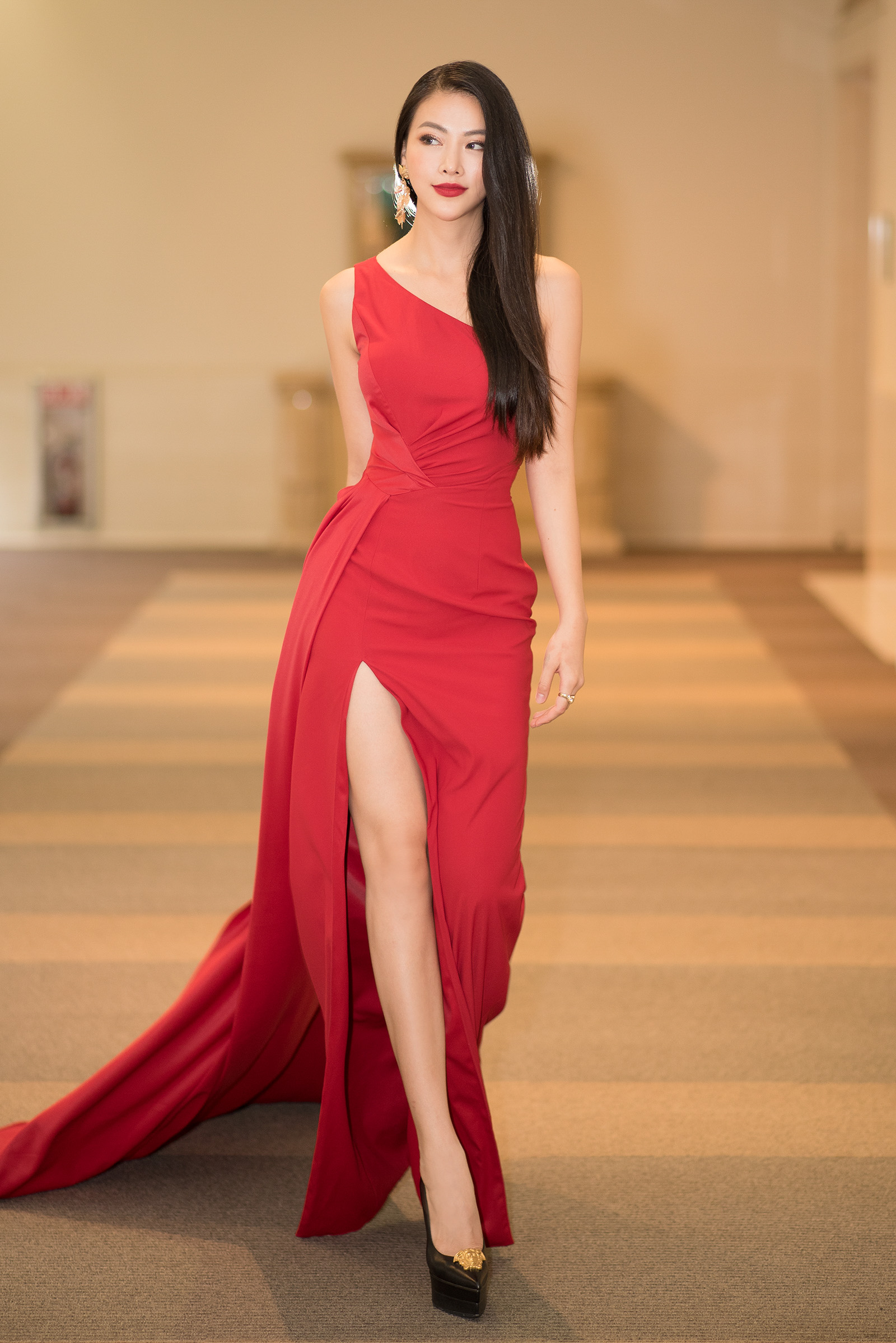 Không đầm kim sa, không đính đá cầu kì nhưng Phương Khánh vẫn hạ gục mọi ánh nhìn của các đứng mày râu khi diện bộ cánh màu đỏ xẻ đùi đơn sắc.