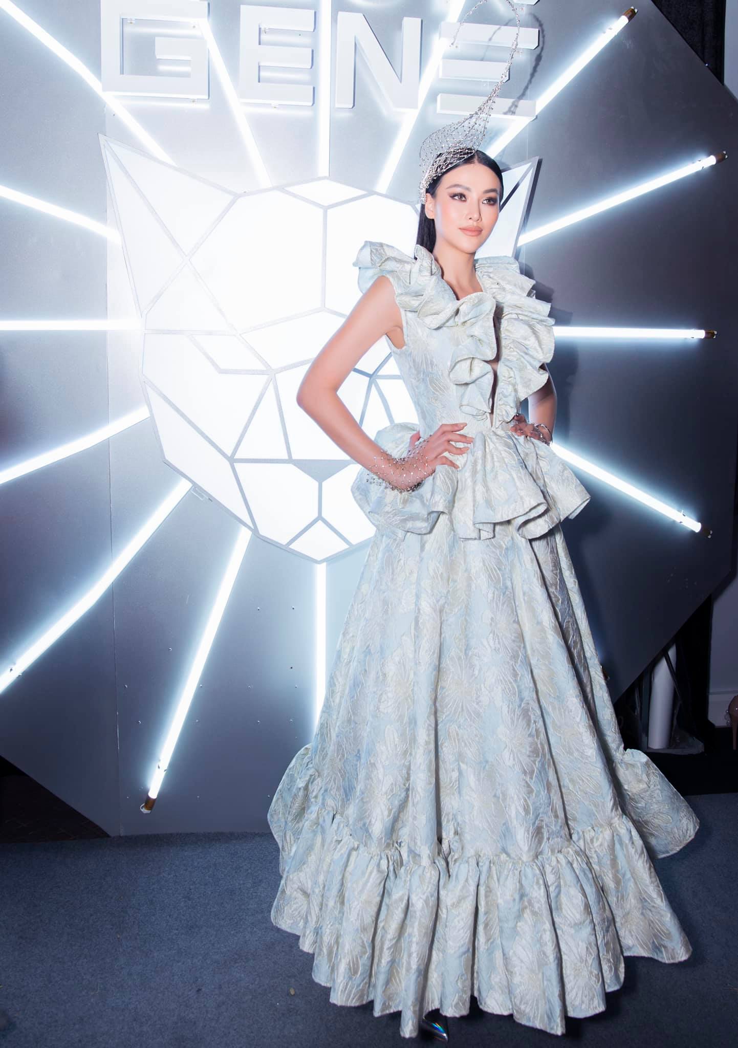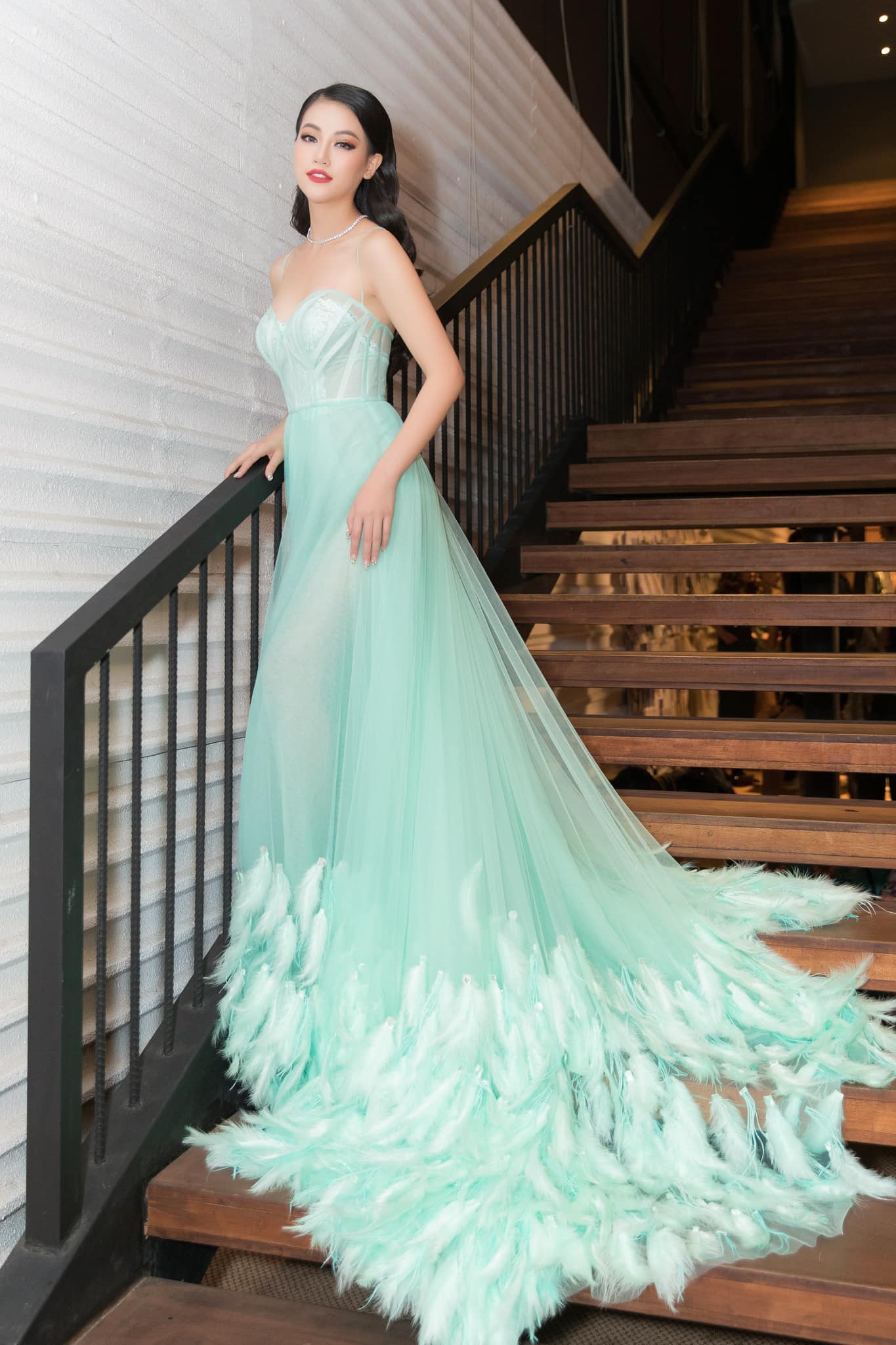 Chọn cho mình bộ đầm sắc xanh pastel nhẹ nhàng bay bổng với thiết kế voan lưới tùng xoè cùng điểm nhấn lông vũ được đính kết tinh xảo, Phương Khánh khiến công chúng không thể rời mắt trước hình ảnh đài các như nàng công chúa bước ra từ cổ tích.