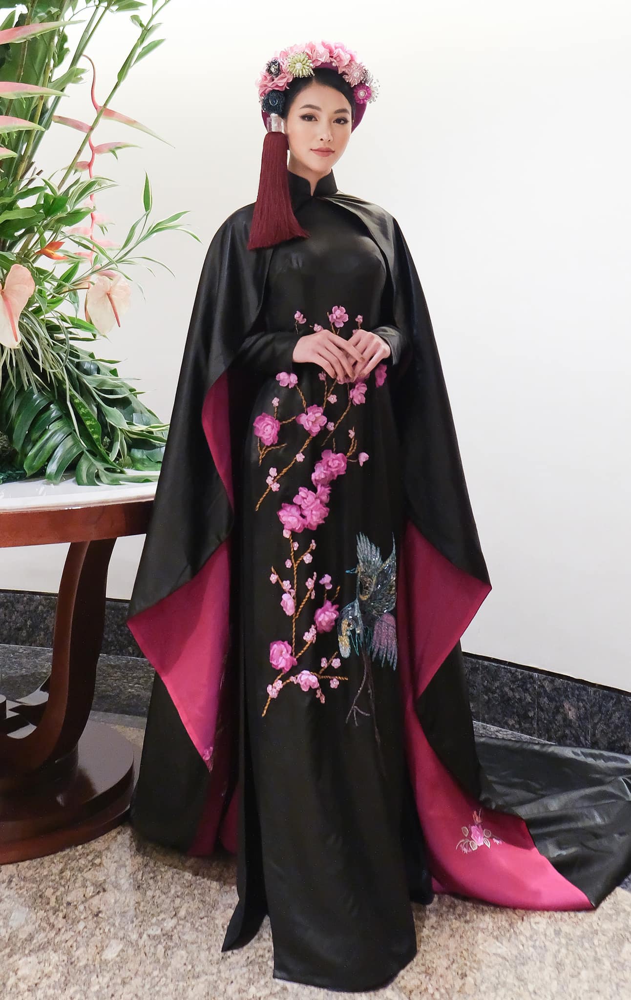 Qúy phái, quyền lực là những mỹ từ cho nhan sắc của Phương Khánh khi diện trên mình bộ áo dài màu đen tuyền này. Phom dáng áo choàng cape cùng chiếc mấn ngàn hoa ăn nhập với họa tiết váy áo. Có lẽ bộ áo dài này sinh ra là chỉ để dành cho Phương Khánh.