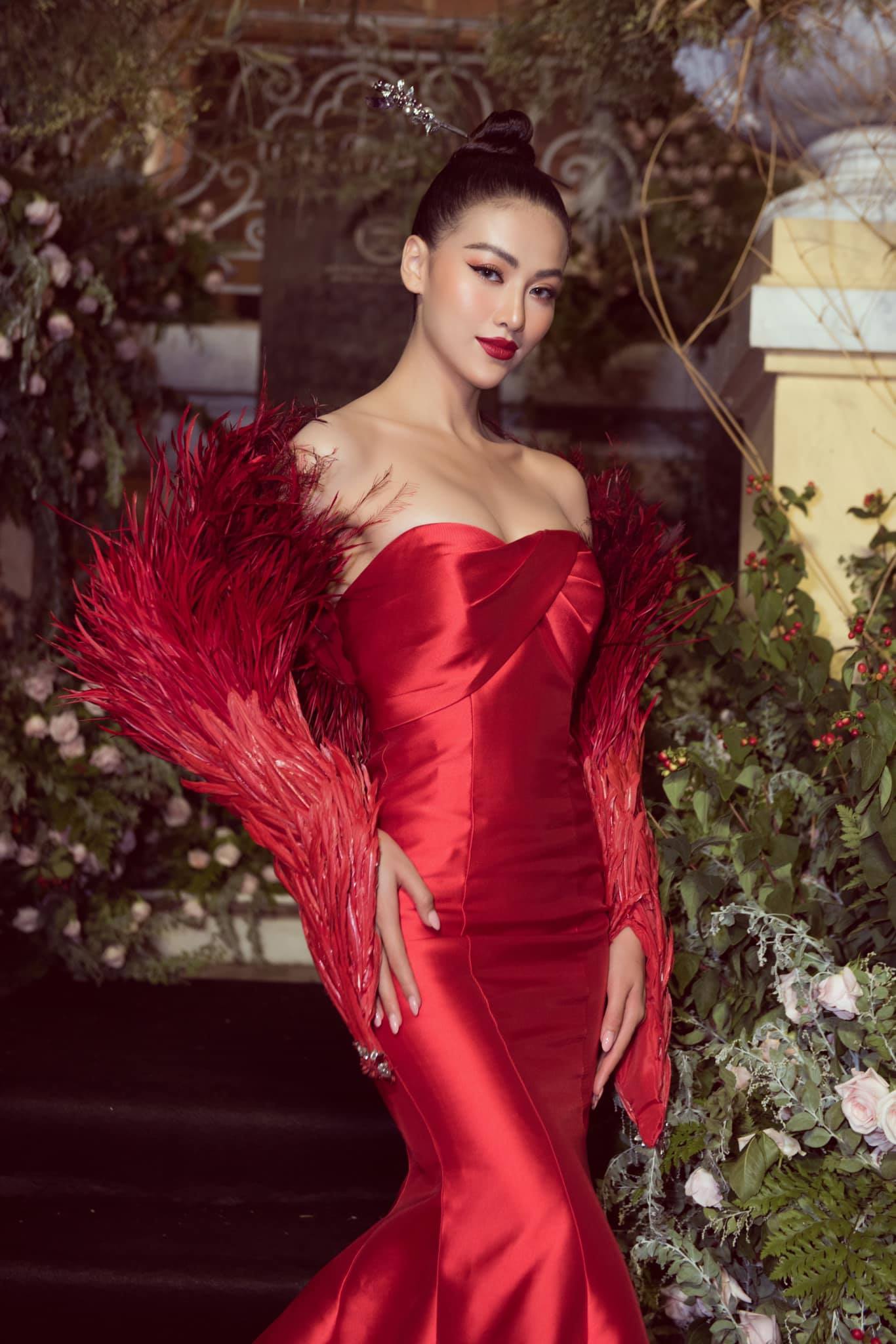Phương Khánh chứng tỏ đẳng cấp thời trang sang trọng, quý phái khi diện trên mình bộ váy màu đỏ rực rỡ. Phần cánh tay tua rua phom dáng tạo khối, son môi đỏ đậm, mắt mèo là những items nâng tầm set đồ của Miss Earth 2018.