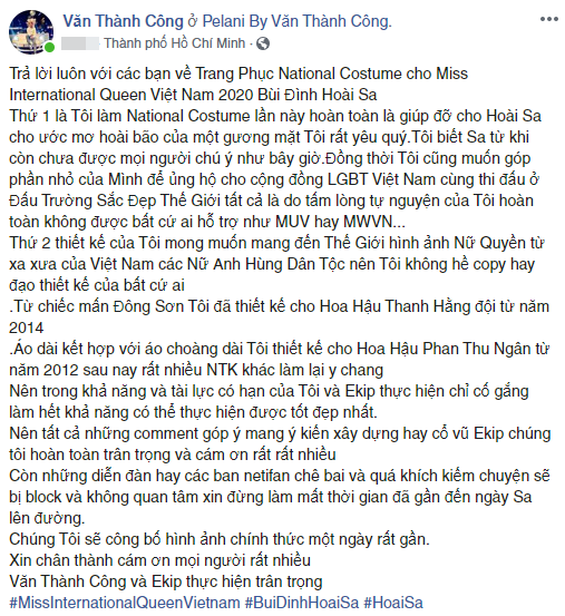 Dòng trạng thái được NTK Văn Thành Công chia sẻ trên trang cá nhân của mình.