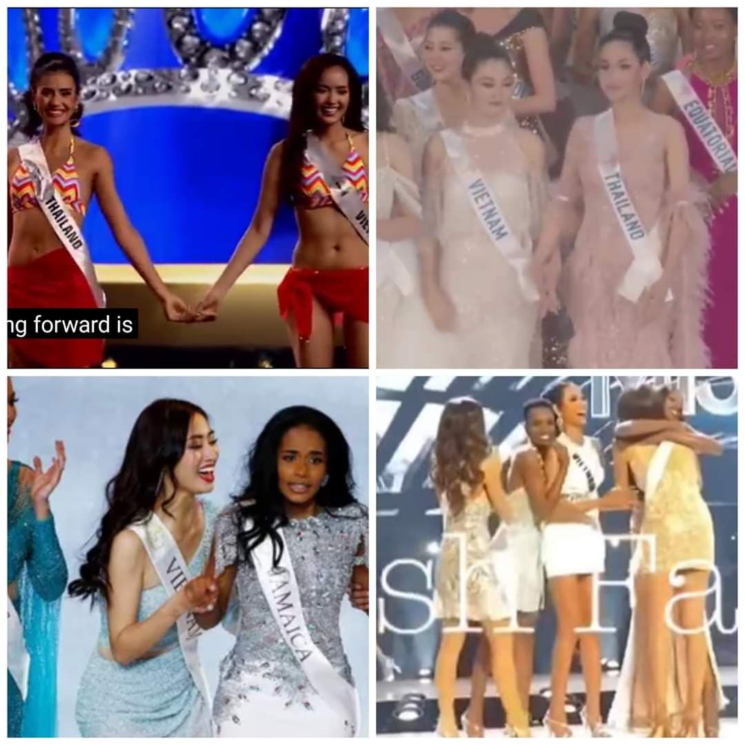 Tại Miss Universe 2019, người hâm mộ thích thú trước hình ảnh hậu trường được khán giả chụp lại khoảnh khắc người đẹp Nam Phi - Zozibini Tunzi ôm Hoàng Thùy từ phía sau khi cả 2 đều lọt vào Top 20 thuộc khu vực Phi - Á - Thái Bình Dương.