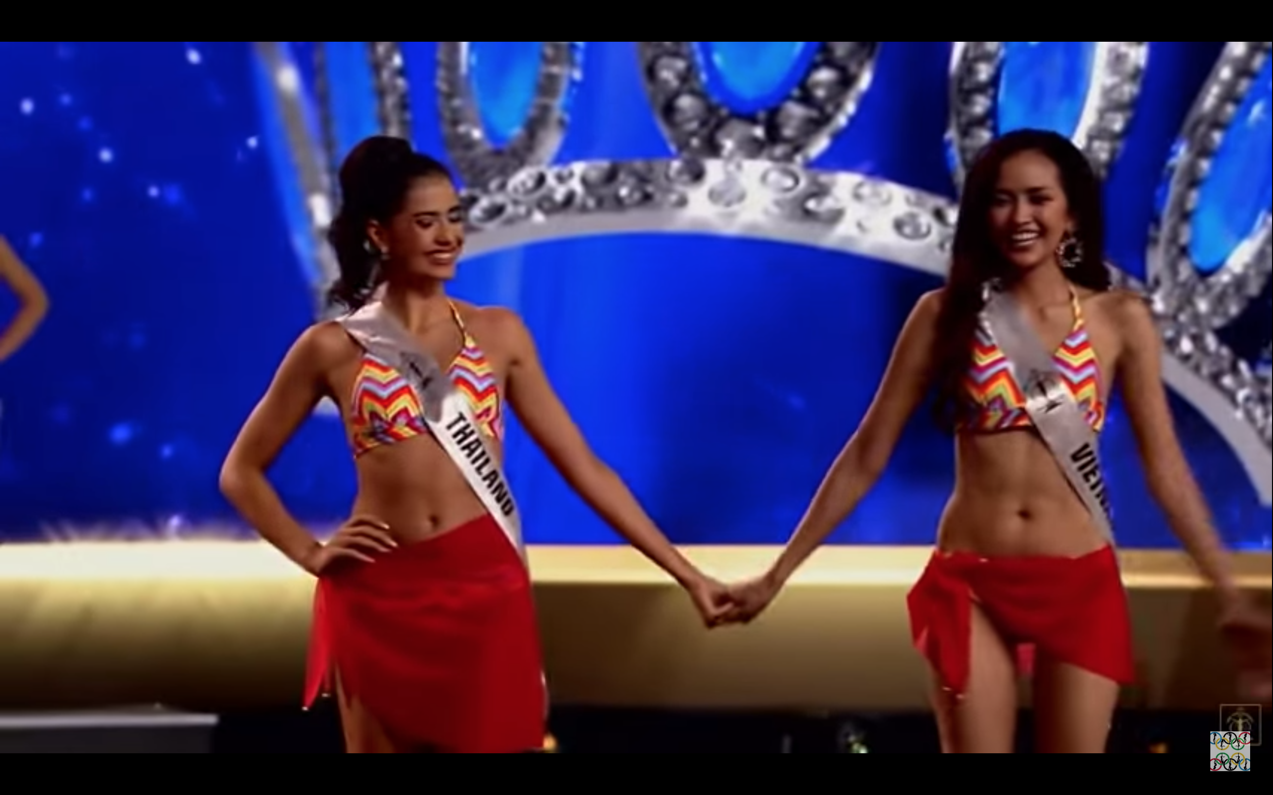 Tương tự, hoa hậu đăng quang - Sireethorn Leearamwat đến từ Thái Lan cũng trùng hợp được xếp đứng cạnh đại diện Việt Nam và cả 2 đều nắm chặt tay trước khi MC đọc tên người chiến thắng.