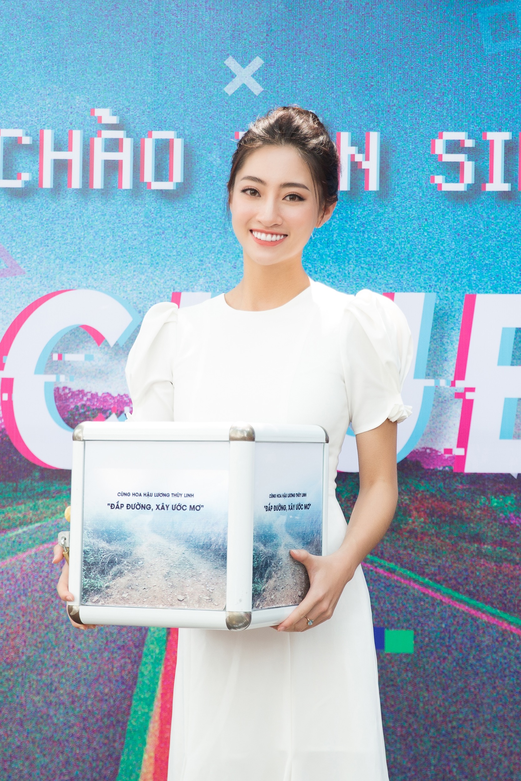 Đặc biệt, trong buổi lễ chào mừng đầy ý nghĩa, hoa hậu đã đích thân ôm thùng từ thiện và kêu gọi các bạn sinh viên cùng chung tay ủng hộ cho Dự án nhân ái “Đắp đường, xây ước mơ”. Đây là một trong những hoạt động gây quỹ mà Lương Thùy Linh tạo nên với mong muốn quyên góp đủ số tiền 2.5 tỷ để hoàn thành dự án trong thời gian sớm nhất.
