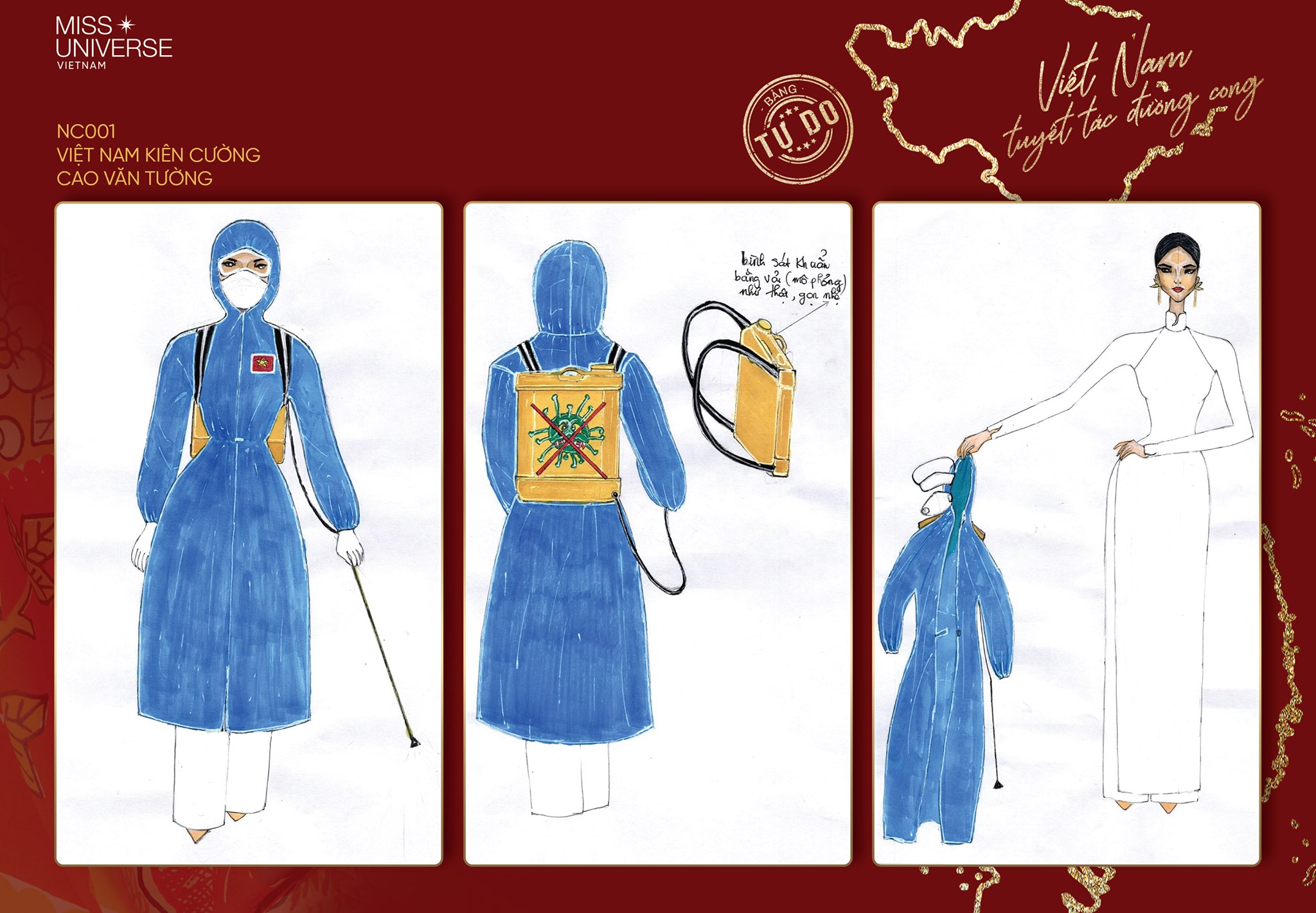 Điểm đặc biệt của mẫu thiết kế này chính là việc kết hợp giữa đồ bảo hộ bên ngoài và tà áo dài màu trắng duyên dáng bên trong. Việc đưa các họa tiết mang tính biểu tượng cao như bình xịt sát khuẩn, khẩu trang y tế khiến fan rất thích thú và nhận được rất nhiều sự ủng hộ ngay khi mới trình làng. Cha đẻ của mẫu thiết kế này chia sẻ: “Áo bảo hộ bên ngoài thiết kế để dễ tháo ra khi trình diễn”.