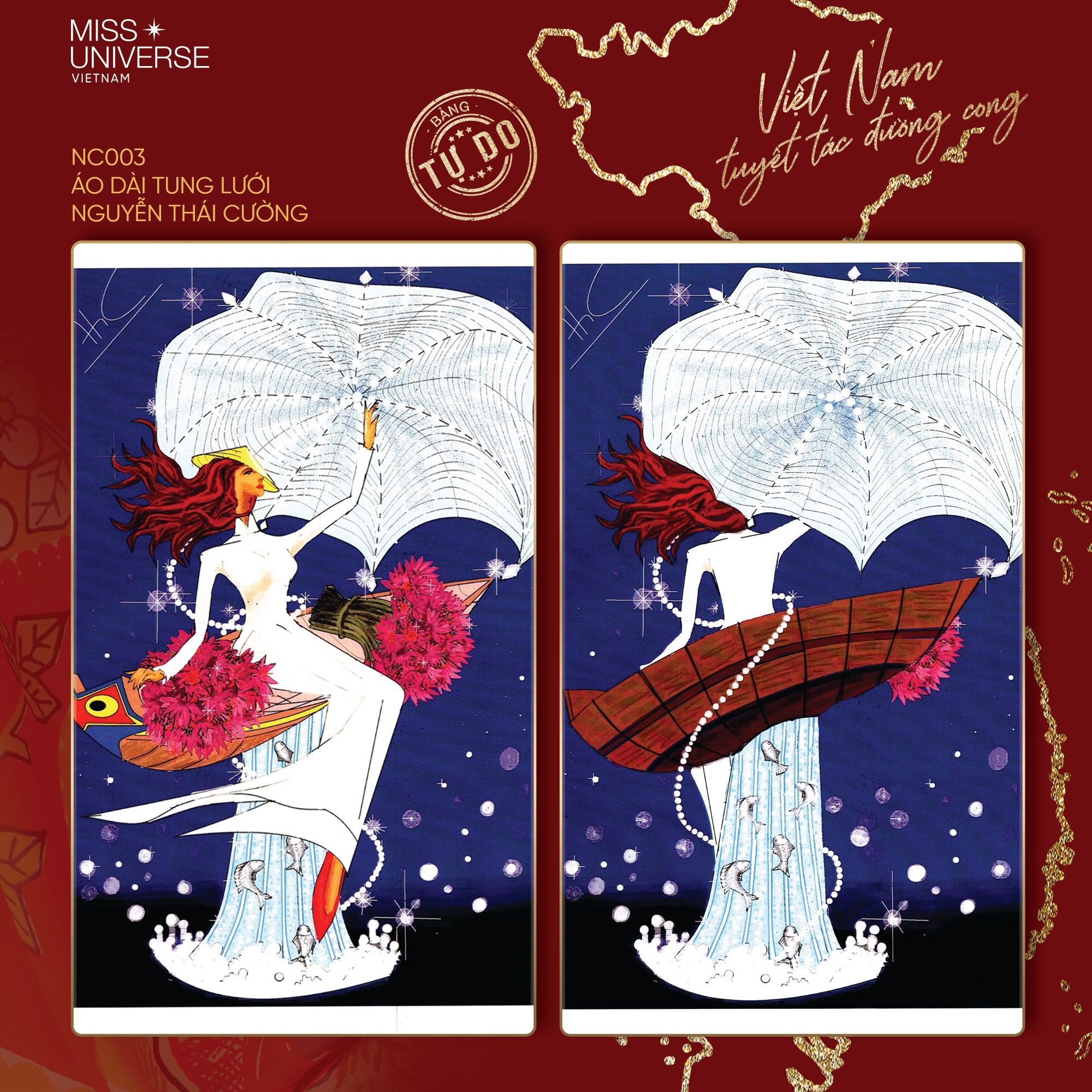 Mẫu thiết kế thứ 3 có tên gọi Áo dài tung lưới. Việc giữ đúng tinh thần của bộ áo dài với hình ảnh cô gái thanh lịch ngồi trên ghe thuyền đang thực hiện động tác văn lưới. Đây được xem là một bức tranh toàn cảnh về một vùng quê Đồng Tháp Mười thu nhỏ với những họa tiết nổi bật: Hoa điên điển bung nở, hoa súng đầy đồng, những đàn cá linh, cá sặc, cá rô.
