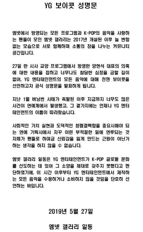 Thông báo chính thức tẩy chay YG Entertainment từ một forum về các chương trình của Mnet.