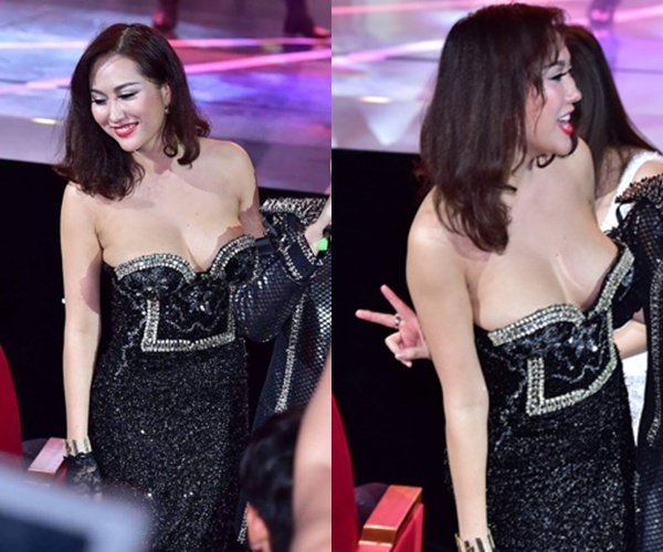Xuất hiện tại một sự kiện mới đây, Phi Thanh Vân diện đầm dạ hội cúp ngực dáng xòe thêu hoa tỉ mỉ, tinh tế. Tuy nhiên vòng một quá khổ khiến người xem ”thót tim” lo lắng nữ diễn viên gặp sự cố váy áo.