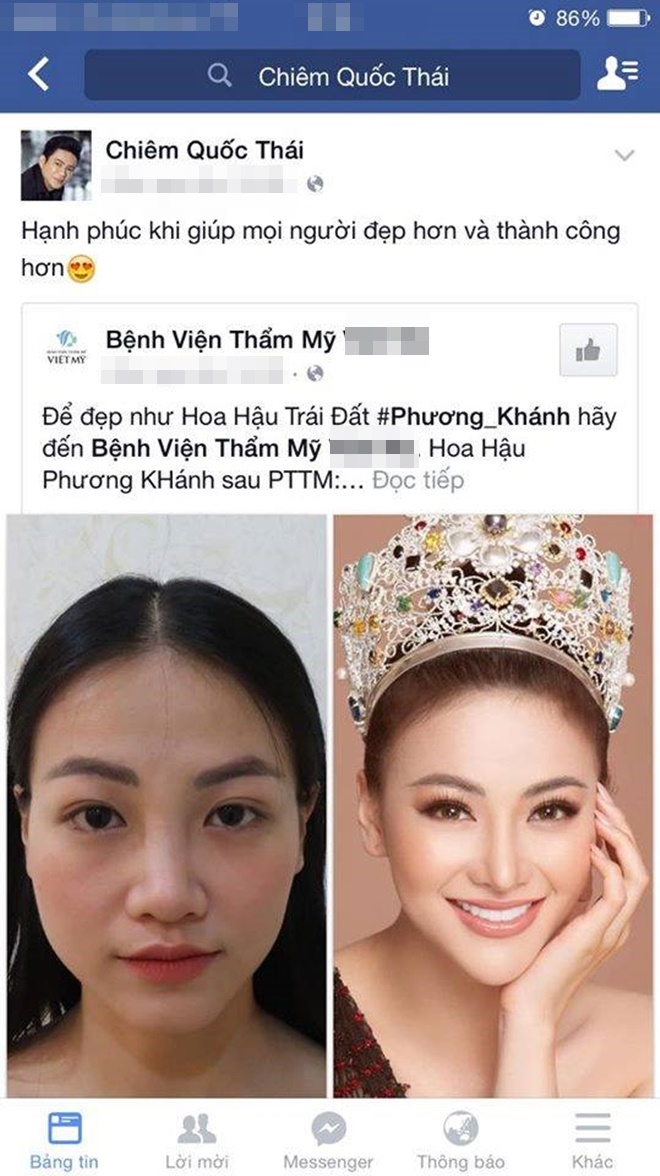 Mới đây trên trang cá nhân của mình, bác sĩ Chiêm Quốc Thái khiến nhiều người bất ngờ khi chia sẻ lại dòng trạng thái của Bệnh viện thẩm mỹ nơi ông đang trực tiếp làm việc hình ảnh trước và sau khi phẫu thuật của Phương Khánh. Ngay lập tức, bức ảnh nhận được nhiều sự chú ý từ phía người hâm mộ.