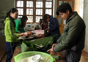 Giáo viên trường Phổ thông Dân tộc Bán trú THCS Nậm Càn gói bánh cho học sinh đón tất niên. Ảnh: Báo Nghệ An.