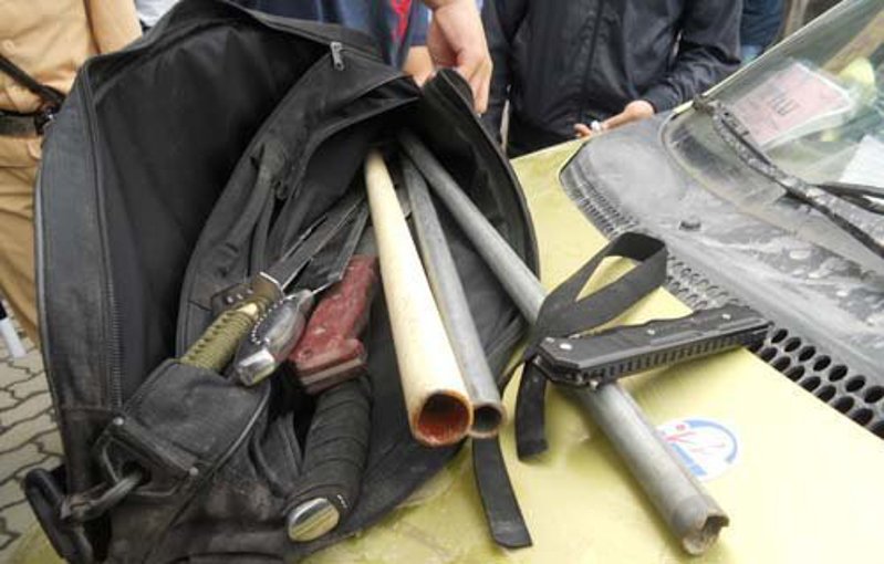 Trong cốp xe chứa cả “kho vũ khí” gồm 4 dao “tông”, 1 bộ song đao, 3 tuýp sắt đã vót nhọn đầu và 1 dây cao su. Trong số hung khí có 1 chiếc đao còn dính nguyên vết máu.