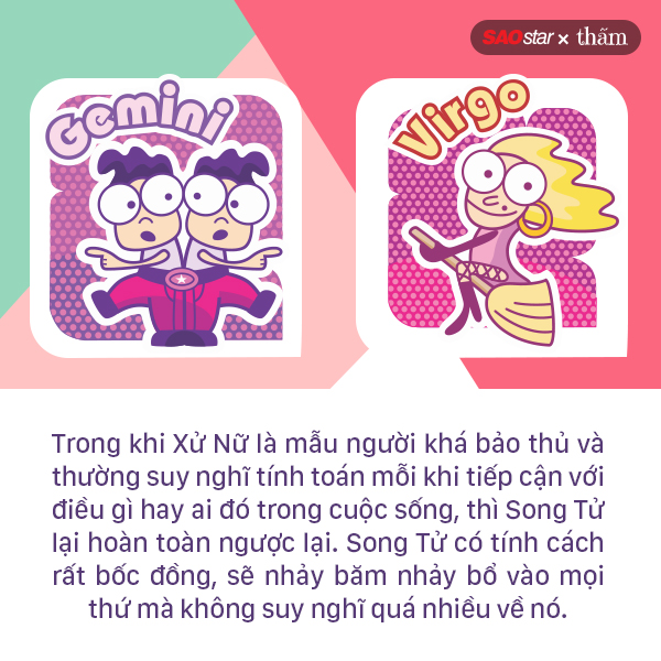 Trong khi Xử Nữ là mẫu người khá bảo thủ và thường suy nghĩ tính toán mỗi khi tiếp cận với điều gì hay ai đó trong cuộc sống, thì Song Tử lại hoàn toàn ngược lại. Song Tử có tính cách rất bốc đồng, sẽ nhảy băm nhảy bổ vào mọi thứ mà không suy nghĩ quá nhiều về nó. Một người với tâm hồn và bản năng tự do như Song Tử sẽ khiến một người quy tắc như Xử Nữ phát điên, và rồi không sớm thì muộn sự nghiêm túc trong tính cách của Xử Nữ sẽ khiến Xử Nữ thấy phát chán Song Tử đến tận cổ.