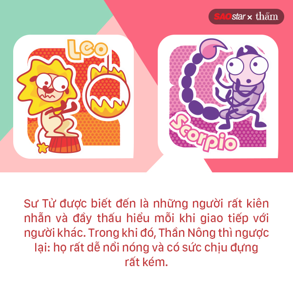 Sư Tử được biết đến là những người rất kiên nhẫn và đầy thấu hiểu mỗi khi giao tiếp với người khác. Trong khi đó, Thần Nông thì ngược lại: họ rất dễ nổi nóng và có sức chịu đựng rất kém. Mỗi khi hai người ở cạnh nhau, những tình huống tệ hại sẽ dễ diễn ra, và điều này về lâu dài ảnh hưởng không tốt đến tinh thần của cả Sư Tử và Thần Nông. Cuối cùng, sự tan vỡ sẽ ập đến, khiến cả hai đầy thương tổn.