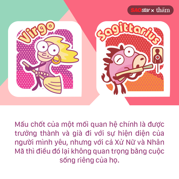 Chuyện gì sẽ xảy ra khi hai người yêu nhau mà cả hai đều là những người độc lập đến mức đáng sợ? Đó là thảm họa! Không có lý gì hai người yêu nhau mà lại như không yêu vậy, ở trong một mối quan hệ yêu đương mà cả hai chỉ khư khư sống cuộc sống của riêng mình, hoàn toàn không có cảm giác muốn gắn kết với người còn lại. Mấu chốt của một mối quan hệ chính là được trưởng thành và già đi với sự hiện diện của người mình yêu, nhưng với cả Xử Nữ và Nhân Mã thì điều đó lại không quan trọng bằng cuộc sống riêng của họ.