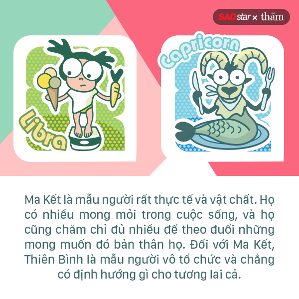 Ma Kết là mẫu người rất thực tế và vật chất. Họ có nhiều mong mỏi trong cuộc sống, và họ cũng chăm chỉ đủ nhiều để theo đuổi những mong muốn đó bản thân họ. Đối với Ma Kết, Thiên Bình là mẫu người vô tổ chức và chẳng có định hướng gì cho tương lai cả. Khi yêu nhau, Ma Kết sẽ cố hết sức để giúp Thiên Bình tìm được lối đi đúng đắn và hướng phát triển cho bản thân mình, nhưng cuối cùng Ma Kết cũng phải thất vọng vì bản thân Thiên Bình chẳng quan tâm đến chuyện đó cho lắm.