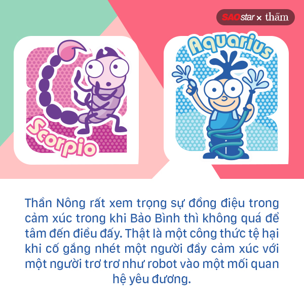 Thần Nông rất xem trọng sự đồng điệu trong cảm xúc trong khi Bảo Bình thì không quá để tâm đến điều đấy. Thật là một công thức tệ hại khi cố gắng nhét một người đầy cảm xúc với một người trơ trơ như robot vào một mối quan hệ yêu đương. Đến cuối cùng, Bảo Bình sẽ cố điều khiển cảm xúc của Thần Nông sao cho Thần Nông phải chiều theo mình, sự mất cân bằng này sẽ giết chết tình yêu của cả hai.