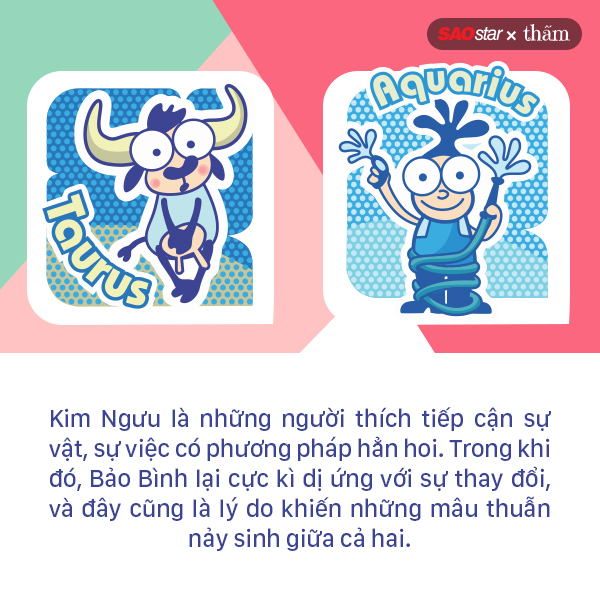 Kim Ngưu là những người thích tiếp cận sự vật, sự việc có phương pháp hẳn hoi. Trong mối quan hệ của mình, họ cư xử bài bản như người ta nghiên cứu khoa học vậy, vì như thế họ có thể dễ dàng điều khiển và dẫn dắt mọi thứ đi theo mong đợi của bản thân. Trong khi đó, Bảo Bình lại cực kì dị ứng với sự thay đổi, và đây cũng là lý do khiến những mâu thuẫn nảy sinh giữa cả hai.