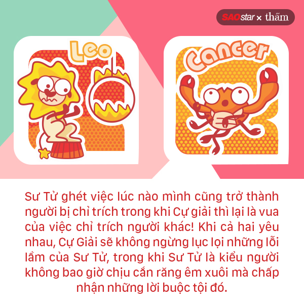 Sư Tử ghét việc lúc nào mình cũng trở thành người bị chỉ trích trong khi Cự giải thì lại là vua của việc chỉ trích người khác! Khi cả hai yêu nhau, Cự Giải sẽ không ngừng lục lọi những lỗi lầm của Sư Tử, trong khi Sư Tử là kiểu người không bao giờ chịu cắn răng êm xuôi mà chấp nhận những lời buộc tội đó. Cả hai cố gắng hứa hẹn thay đổi và làm mọi chuyện tốt hơn, nhưng những vết nứt từ việc dày xéo lẫn nhau đó ảnh hưởng quá nhiều, khiến họ không thể tiếp tục bên nhau thêm nữa.