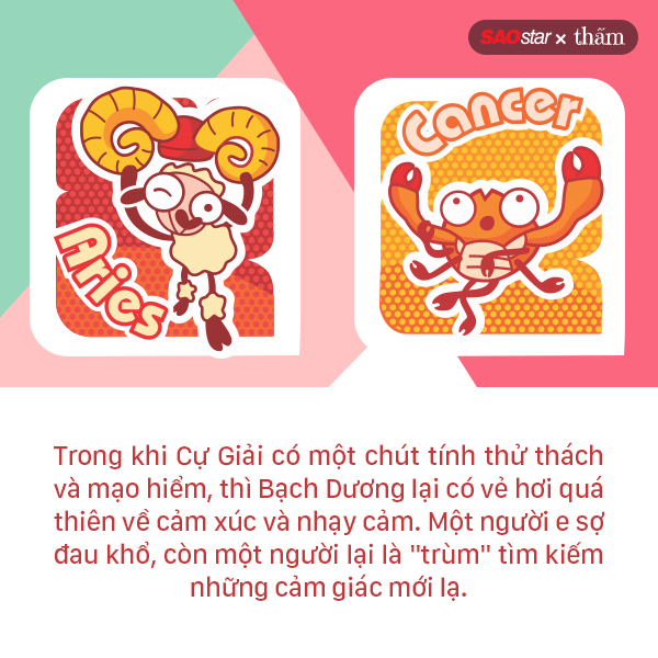 Trong khi Cự Giải có một chút tính thử thách và mạo hiểm, thì Bạch Dương lại có vẻ hơi quá thiên về cảm xúc và nhạy cảm. Một người e sợ đau khổ, còn một người lại là “trùm” tìm kiếm những cảm giác mới lạ. Mối quan hệ giữa hai cung hoàng đạo này sẽ không bao giờ thuận lợi bởi căn bản tính cách của họ đã chẳng hợp nhau chút nào cả.