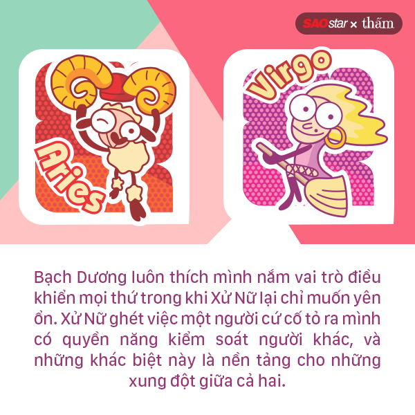 Bạch Dương luôn thích mình nắm vai trò điều khiển mọi thứ trong khi Xử Nữ lại chỉ muốn yên ổn. Xử Nữ ghét việc một người cứ cố tỏ ra mình có quyền năng kiểm soát người khác, và những khác biệt này là nền tảng cho những xung đột giữa cả hai. Bạch Dương thích “giam giữ” người khác trong cái lồng mình tạo ra, còn Xử Nữ lại không thích bị “giam lỏng” như thế.