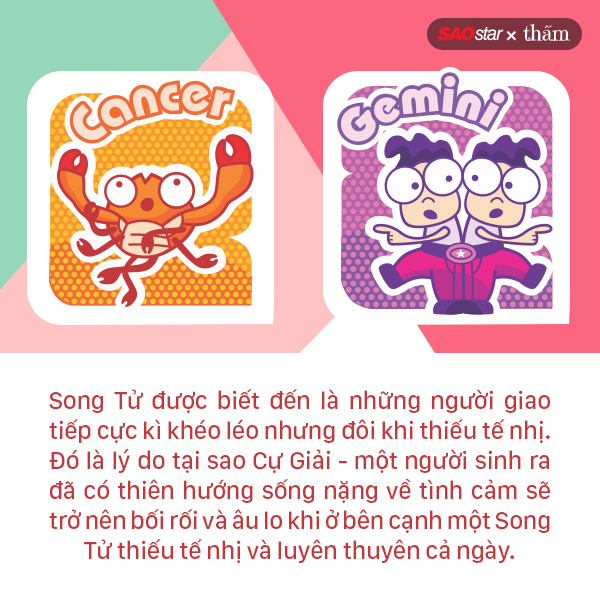 Song Tử được biết đến là những người giao tiếp cực kì khéo léo, biết cách giữ cho cuộc trò chuyện được thú vị. Tuy nhiên, bởi vì nói quá nhiều nên đôi khi họ cũng kém tế nhị. Đó là lý do tại sao Cự Giải - một người sinh ra đã có thiên hướng sống nặng về tình cảm sẽ trở nên bối rối và âu lo khi ở bên cạnh một Song Tử thiếu tế nhị và luyên thuyên cả ngày.