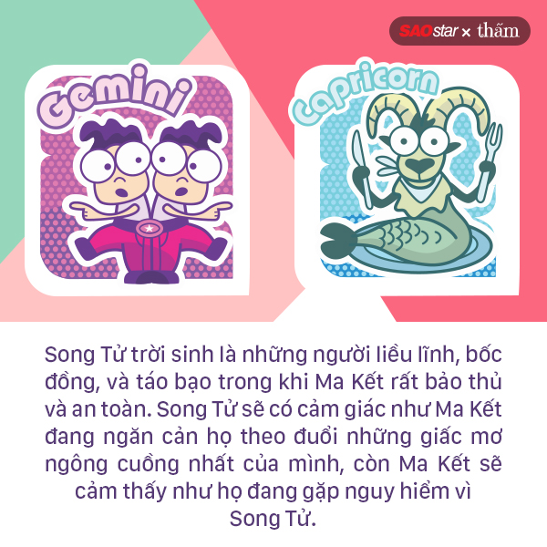 Song Tử trời sinh là những người liều lĩnh, bốc đồng, và táo bạo trong khi Ma Kết rất bảo thủ và an toàn. Song Tử sẽ có cảm giác như Ma Kết đang ngăn cản họ theo đuổi những giấc mơ ngông cuồng nhất của mình, còn Ma Kết sẽ cảm thấy như họ đang gặp nguy hiểm vì Song Tử. Cứ một người thích bay nhảy và một người thích khép mình thì làm sao có được kết thúc có hậu nào chứ, không thể nào!