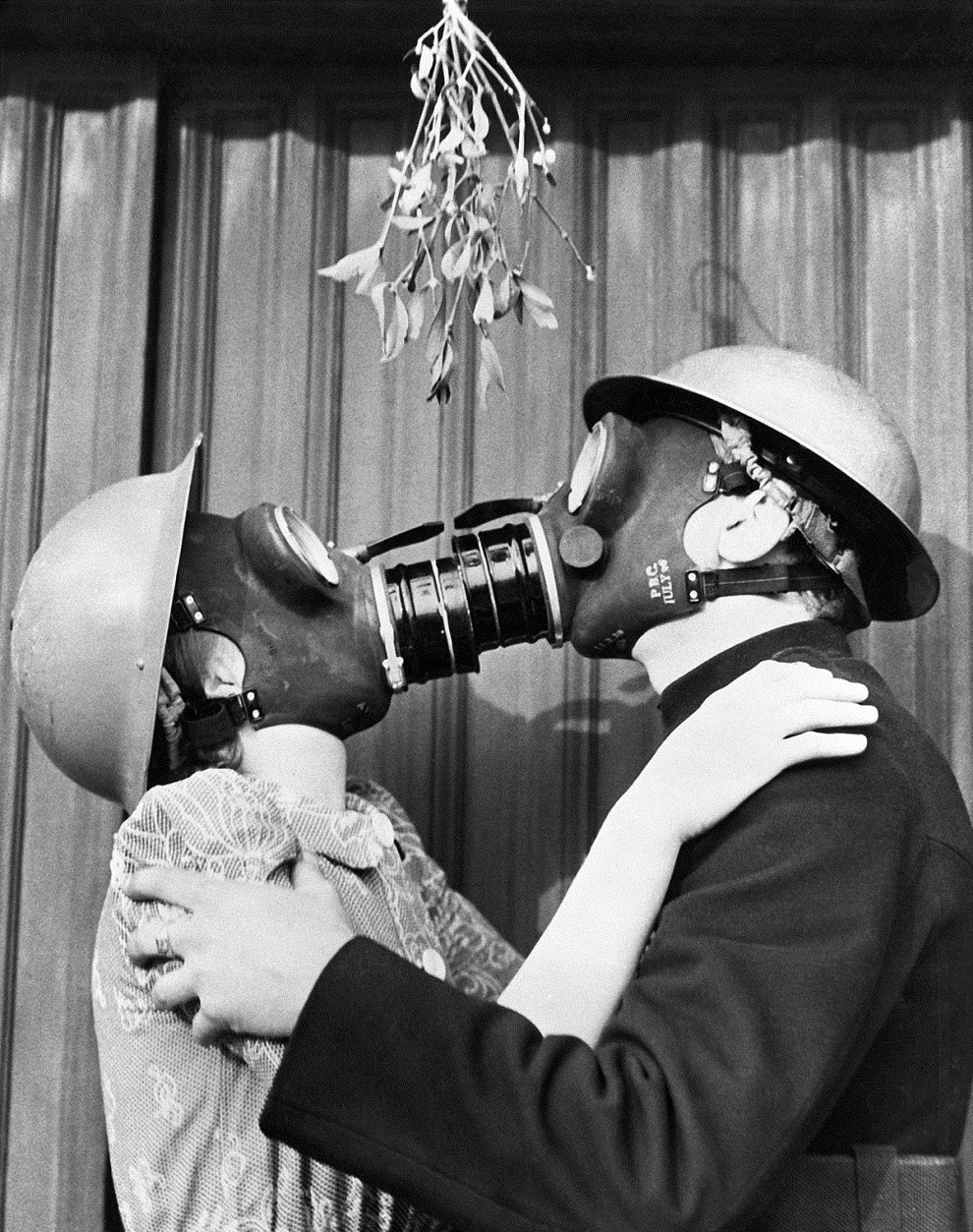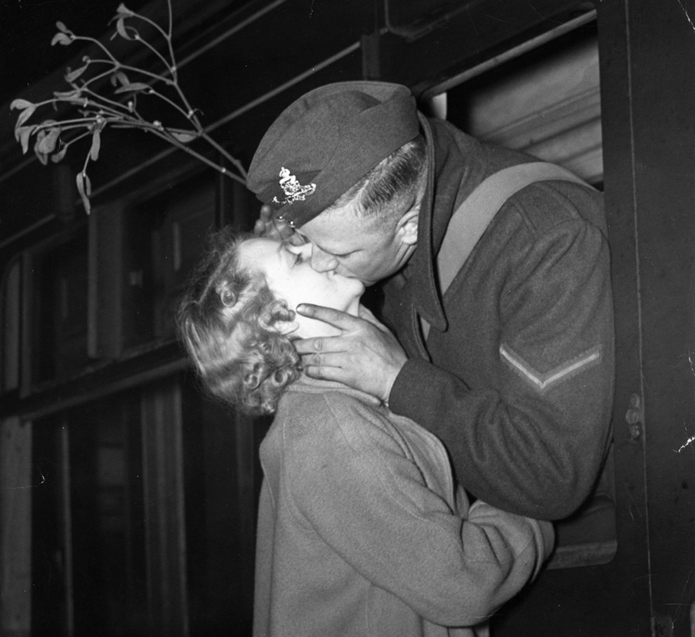 Nụ hôn ly biệt dưới nhành cây tầm gửi (biểu tượng cho tình yêu vĩnh hằng) của một người lính và “người thương” trong ngày kỷ niệm Chúa sinh ra đời năm 1939. Ảnh: Gerry Cranham.