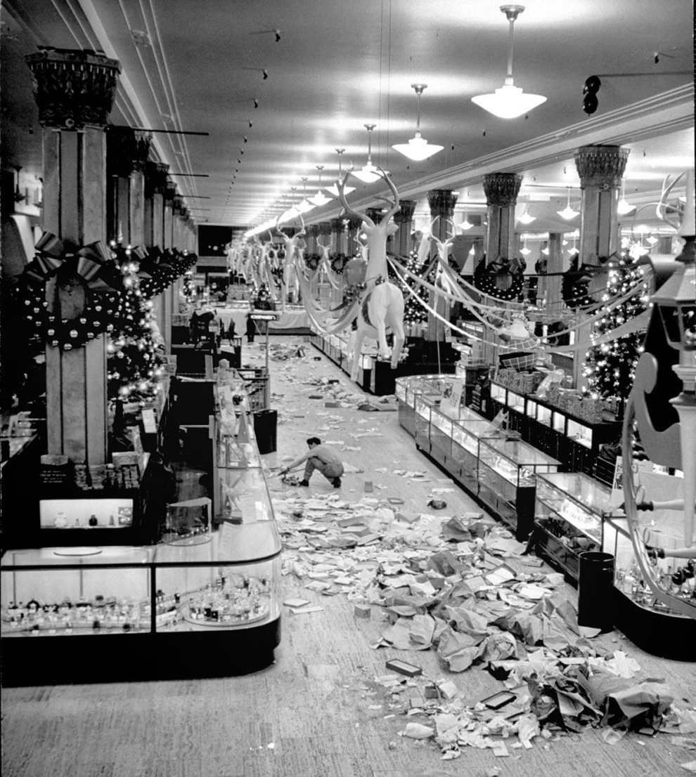 Sau khi khách hàng đổ xô tới mua sắm, khung cảnh tại chuỗi bán lẻ cao cấp NYC’s Macy’s ở Mỹ trông như “bãi chiến trường”. Khoảnh khắc được chụp vào năm 1948. Ảnh: Nina Leen.