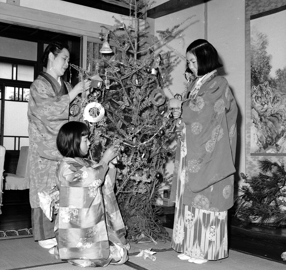 Ba mẹ con diện kimono cùng nhau trang trí cây thông Noel tại nhà ở thành phố Yokohama (Nhật Bản) vào những năm 1950. Ảnh: Evans.