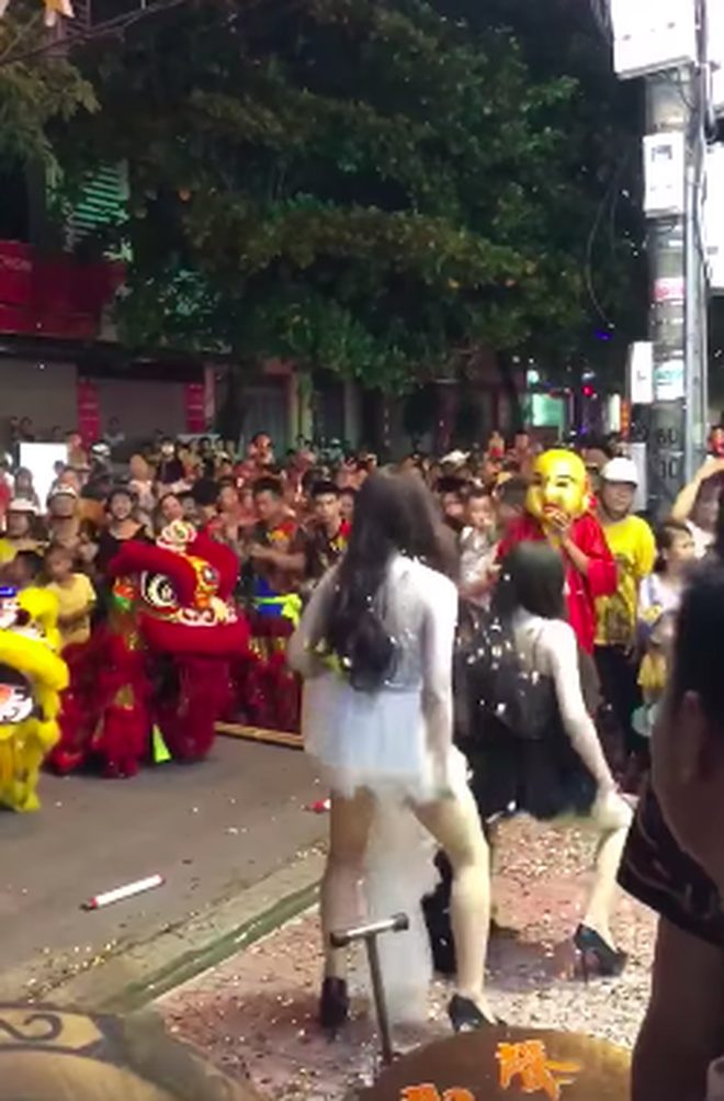 Theo đó, 2 cô gái này mặc váy ngắn, trang điểm đậm và đứng nhảy múa trên đường phố. Đáng chú ý, trong đêm Trung Thu có rất nhiều phụ huynh đưa trẻ em đi dạo phố, đi rước đèn… thế nhưng 2 cô gái này lại có những động tác nhảy múa khiêu gợi, thậm chí, một trong 2 cô gái còn bò ra đất, làm hở nội y.