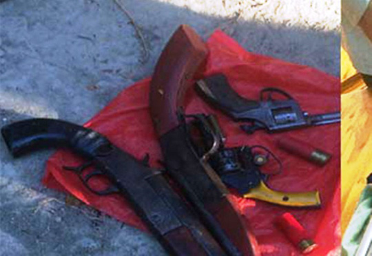Vừa bỏ chạy, nhóm đối tượng côn đồ đi xe ô tô đã cố tình ngáng đường tổ công tác. Trên đường chạy thoát thân, bọn chúng còn để lại túi xách bên trong có 4 khẩu súng tự chế (2 khẩu côn quay, 2 khẩu samlech) và một số viên đạn.
