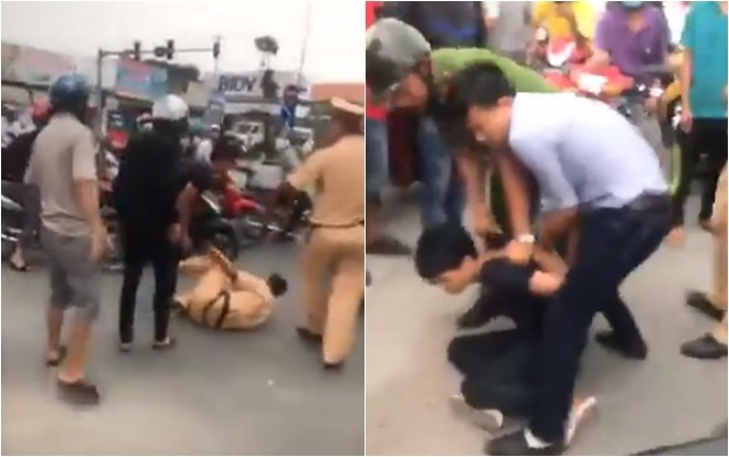 CGST bị xô ngã xuống đường. Ảnh cắt từ clip.Theo thông tin ban đầu, khoảng 17h30 chiều 28/2, tổ công tác thuộc Đội CSGT Công an thị xã Thuận An, tỉnh Bình Dương gồm: Trung úy Huỳnh Nguyễn Minh Châu và Thiếu úy Huỳnh Minh Sang đang làm nhiệm vụ tại khu vực ngã tư giao nhau đường Mỹ Phước - Tân Vạn và DT743.
