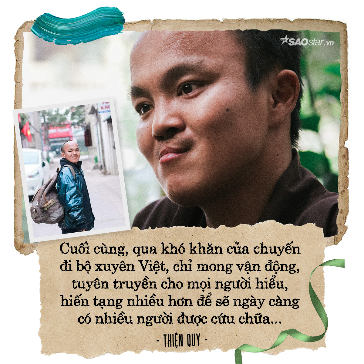 “Cuối cùng thì một người khuyết tât như mình, bỏ hết mọi việc, vượt qua khó khăn đi bộ xuyên Việt cũng chỉ là để mong vận động, tuyên truyền cho mọi người hiểu, để sẽ ngày càng có nhiều người được cứu chữa nhờ nguồn mô, tạng được hiến tặng“, Thiện Quy nói thêm.