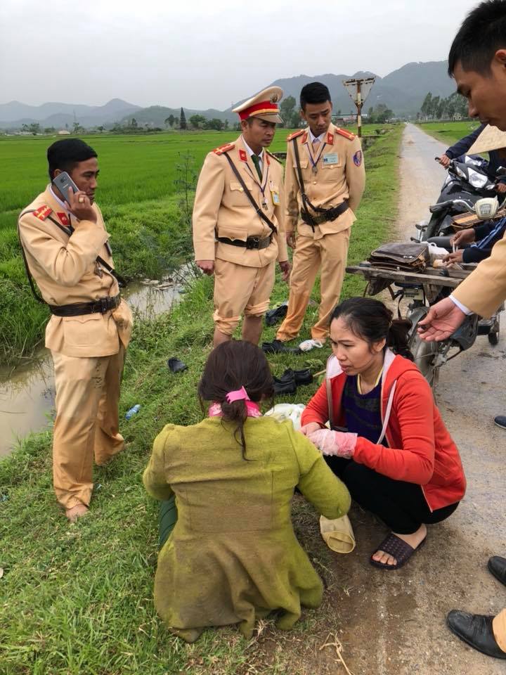 Ngày 8/4, Trung tá Nguyễn Thanh Hồng, Đội trưởng Đội TTKS giao thông 1.46 (PC67 Công an Nghệ An) xác nhận, tổ tuần tra kiểm soát gồm 4 chiến sĩ vừa cứu một phụ nữ gặp tai nạn lao xuống mương nước.