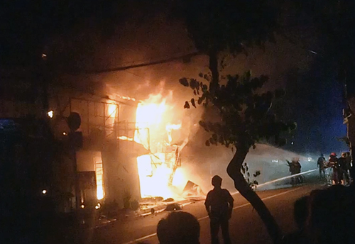 Lửa cháy lan nhanh sang 4 cửa hàng kế bên khiến hàng chục nhà sống gần đó ôm tài sản tháo chạy ra đường. Một số người mắc kẹt bên trong cửa hàng tìm cách phá mái tôn thoát ra ngoài từ nóc nhà.