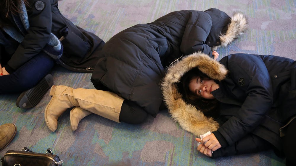 Đầu tuần này, Nhà Trắng đã thông báo không cho người dân xếp hàng trước 6h và việc phát vé chỉ bắt đầu 2 tiếng sau đó, nhưng nhiều người vẫn có mặt từ lúc 3-4h trong cái lạnh 3 độ C. Olivia Michaels, 19 tuổi (phải) và Tatiana Krzesicki, 18 tuổi, nằm trên sàn trung tâm hội nghị để chờ nhận vé. Ảnh: Chicago Tribune.