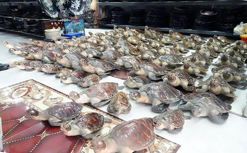 Hai hôm trước, cảnh sát cùng kiểm lâm và quản lý thị trường kiểm tra cửa hàng mỹ nghệ của bà Nguyễn Thị Kim Thu (đường Ba Cu, TP Vũng Tàu) tịch thu 72 tiêu bản rùa, khoảng 47 kg được trưng bày trên tường, cầu thang và trong kho.