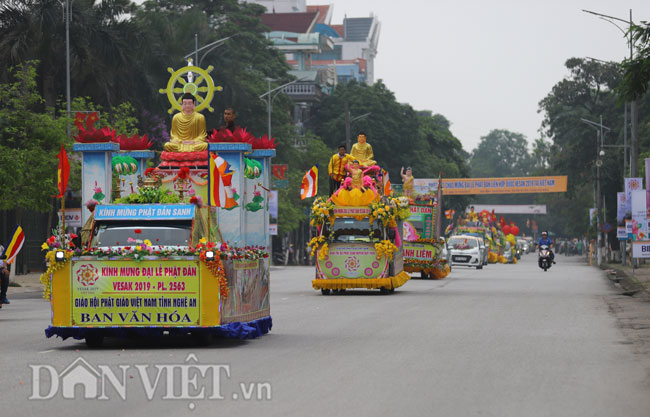Các xe hoa được kết bằng hàng vạn bông hoa tươi, hoa lụa do các phật tử trong và ngoài tỉnh đến tham dự.