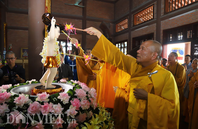 Trước khi nghi thức rước hoa bắt đầu, Chư tôn đức cùng phật tử đã thực hiện lễ tắm Phật.