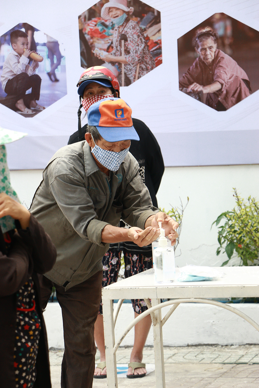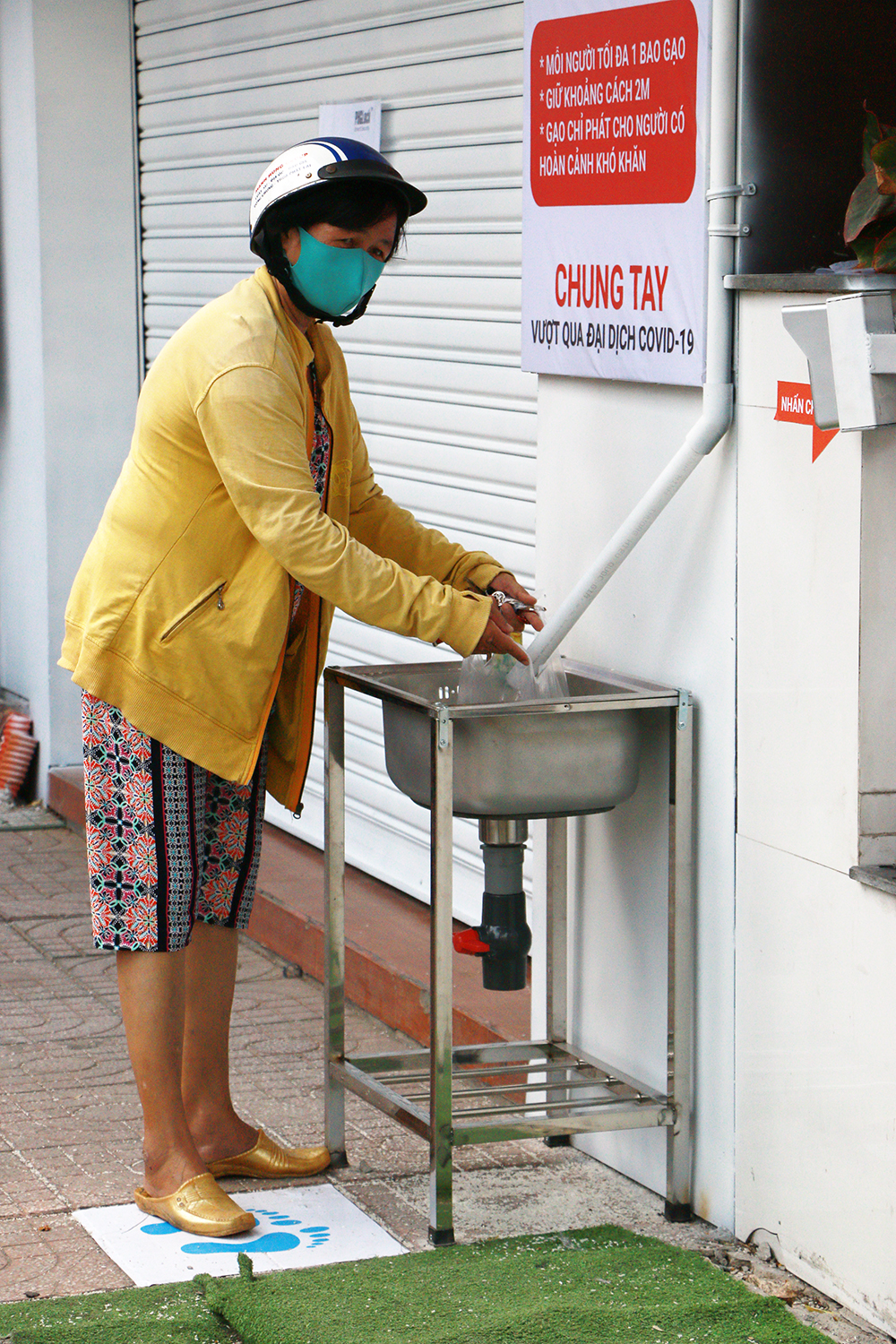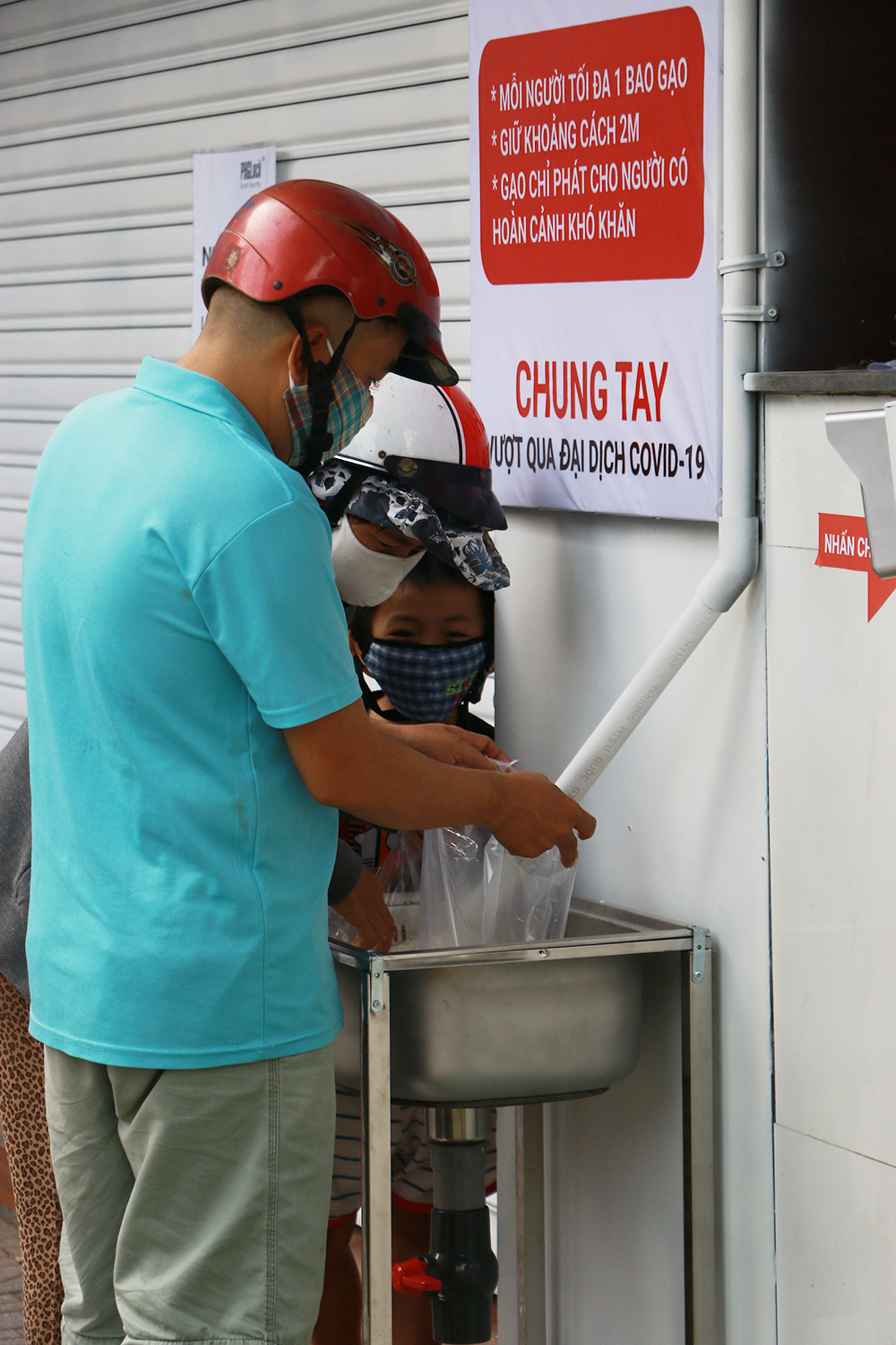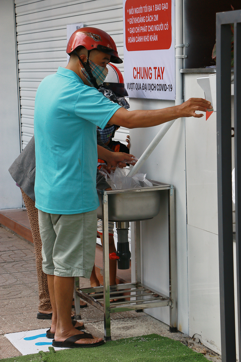 Người đến nhận gạo phải rửa tay trước khi xếp hàng