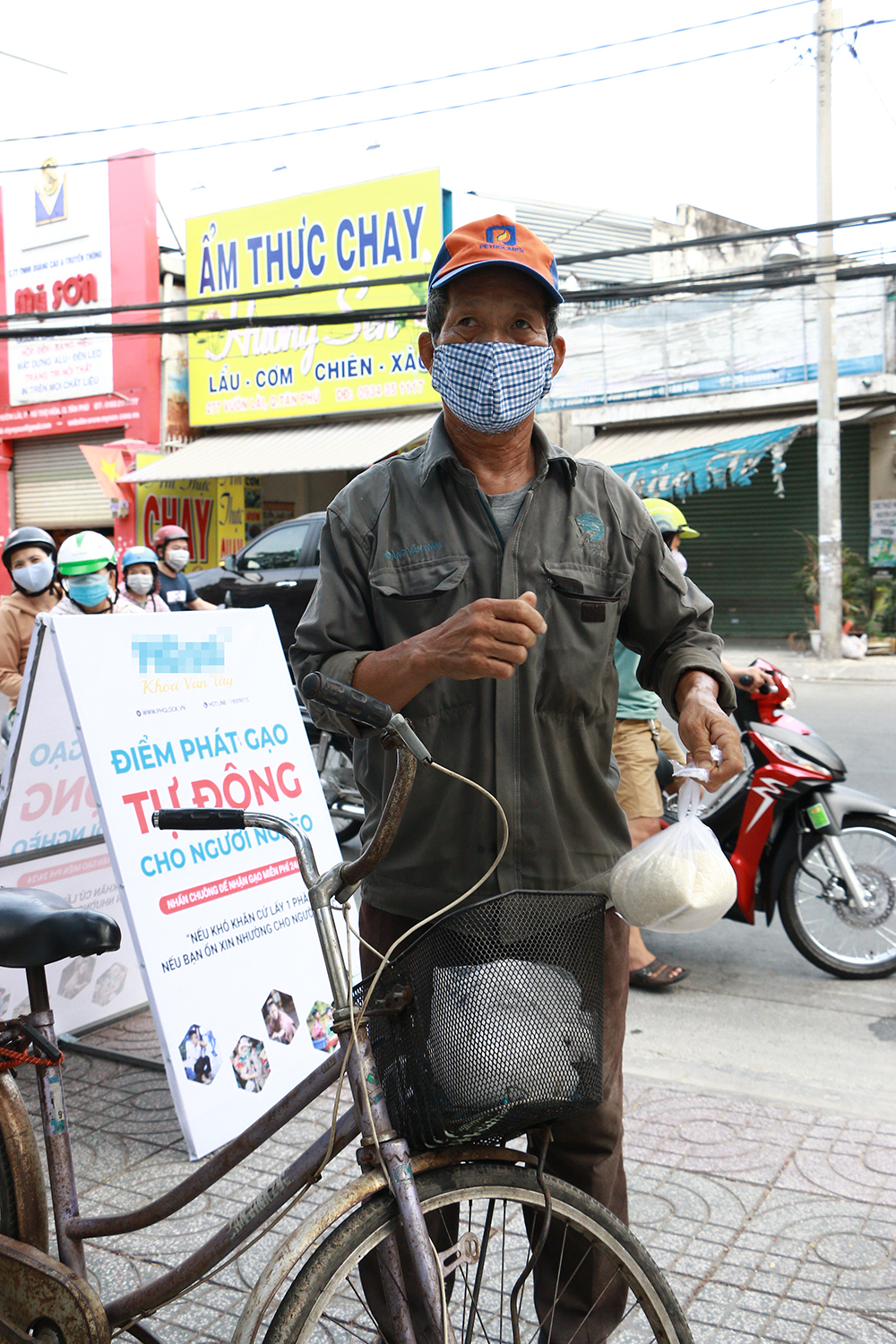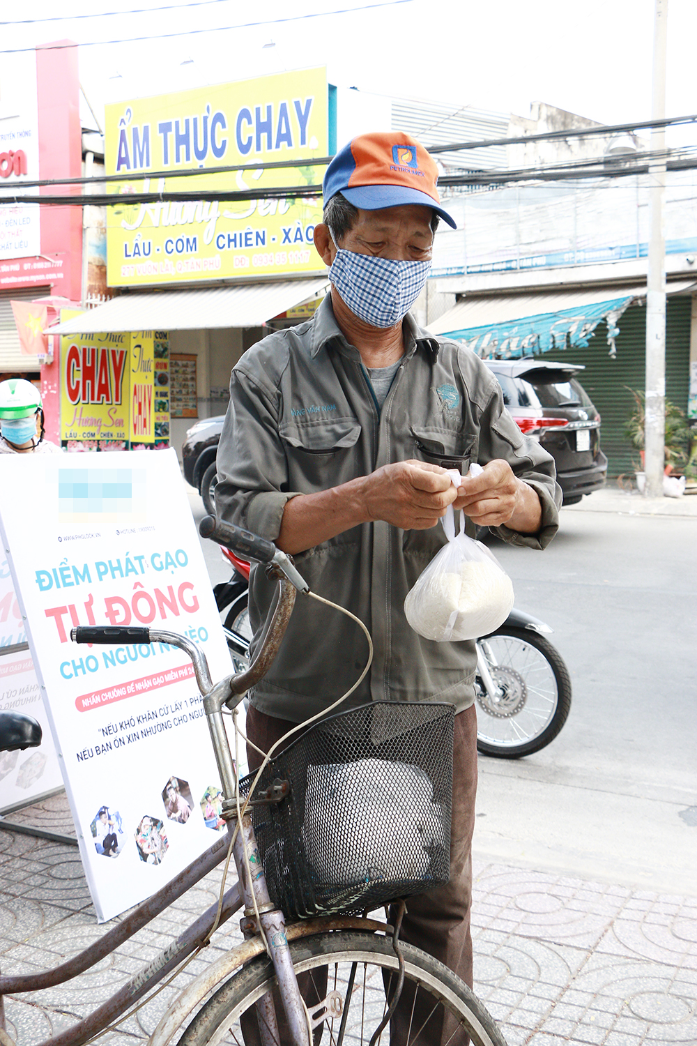 Chú Trần Trọng Hàn cẩn thận cất túi gạo vừa được phát vào giỏ xe đạp của mình.