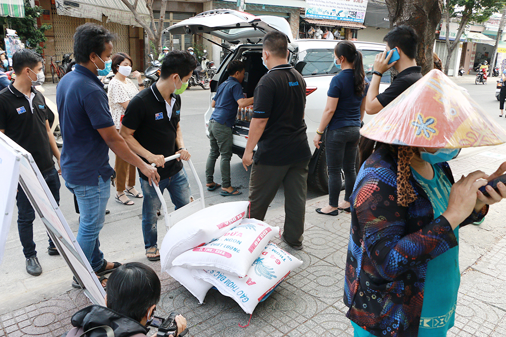 Nhiều mạnh thường quân chung tay góp gạo cùng anh Hoàng Tuấn Anh cứu trợ bà con nghèo trong mùa dịch.