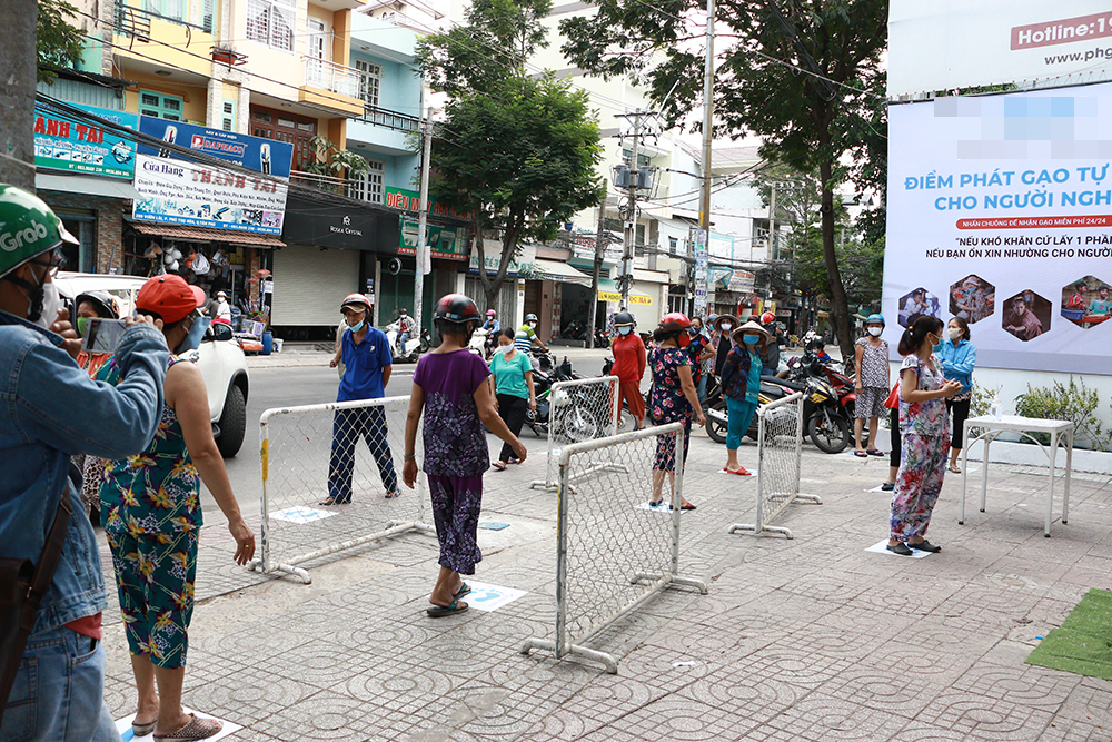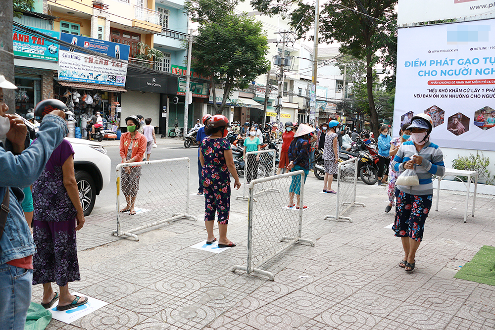 Người dân xếp hàng trật tự và tuân thủ quy định giữ khoảng cách 2 m. Không có tình trạng xô đẩy, chen lấn tại điểm phát gạo từ thiện này.