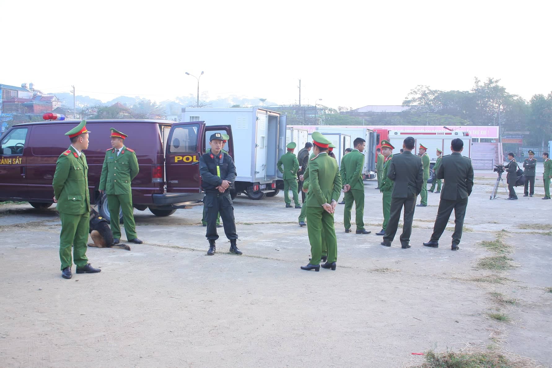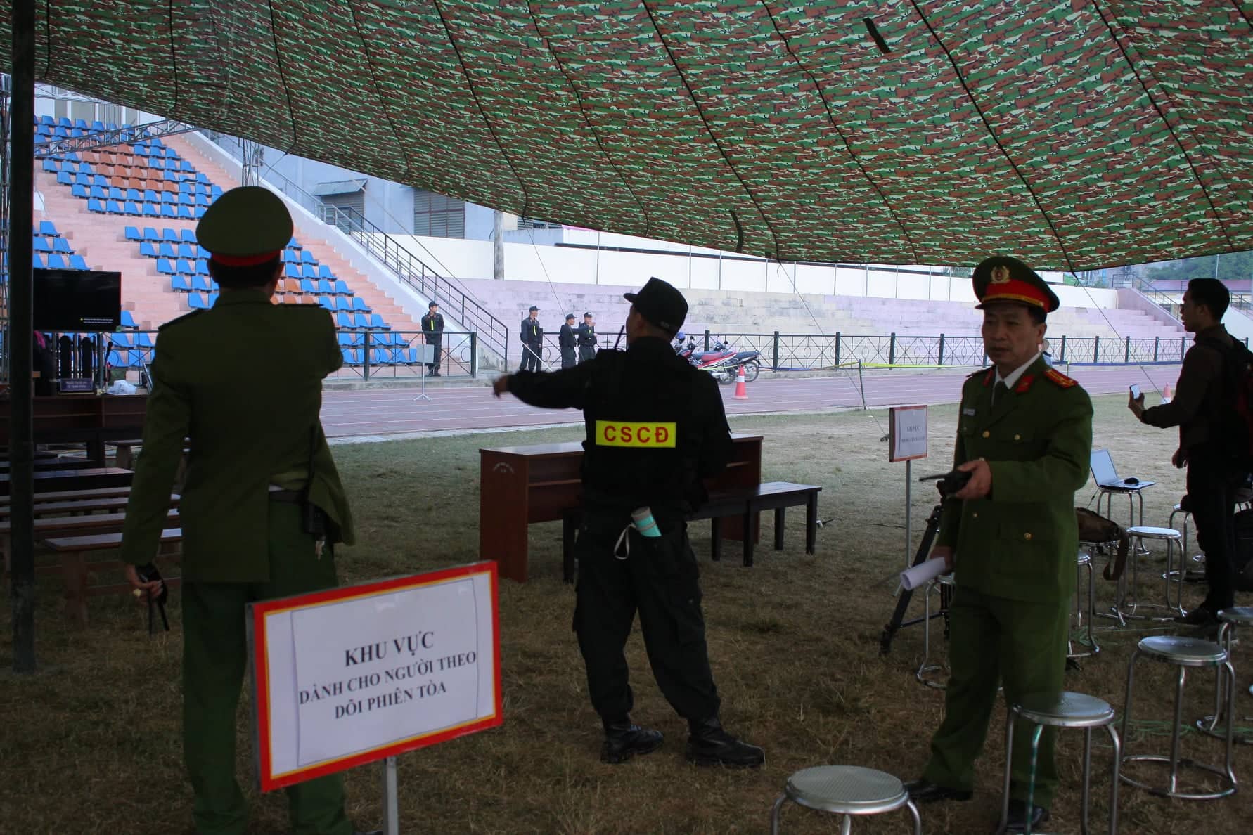 Ngay từ sáng sớm theo ghi nhận của chúng tôi hàng trăm lực lượng an ninh gồm cảnh sát, cảnh sát cơ động… đã được tăng cường thắt chặt quanh khu vực sân vận động TP Điện Biên Phủ nơi diễn ra phiên xét xử. Sân vận động có sức chứa khoảng 8000 người được mở công khai để người dân theo dõi. Chó nghiệp vụ cũng đã được đưa đến bảo vệ quanh khu vực sân vận động. Đúng 7h30 các bị cáo được đưa từ xe thùng đến khu vực xét xử để chuẩn bị cho phiên xét xử dự kiến kéo dài 3 ngày.
