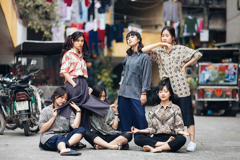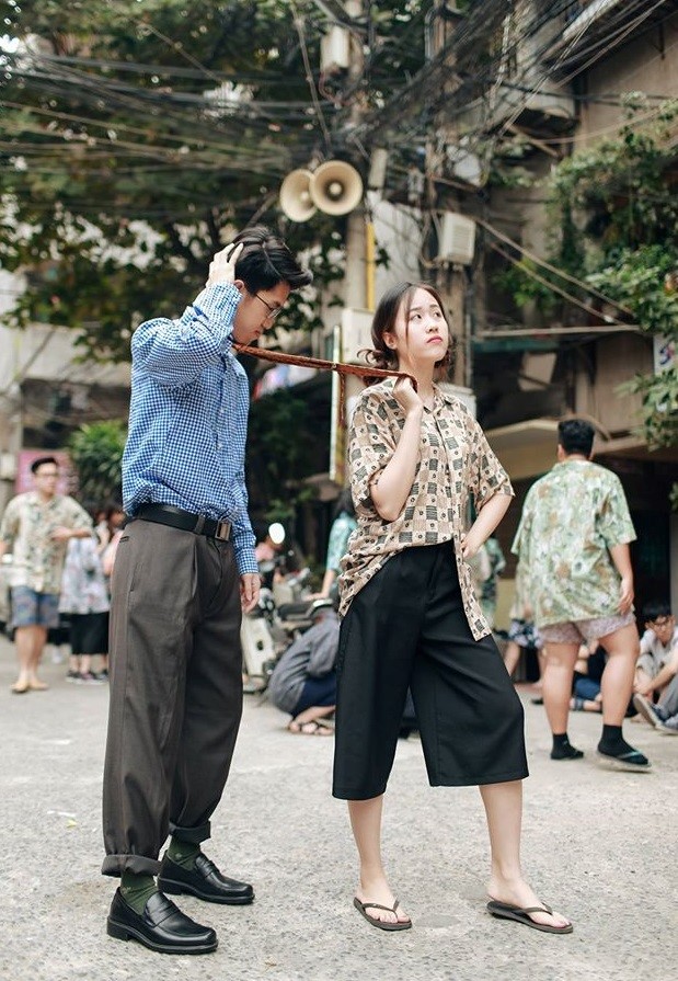 “Chúng mình tốn khá nhiều thời gian để kiếm địa điểm nhà cổ nên cuối cùng quyết định chụp tại khu tập thể Vọng Hà cũ. May mắn là cả lớp tái hiện thành công được thời tóc bổ luống, dép tổ ong”, Ngọc Minh - học sinh lớp 12D1 - cho hay.