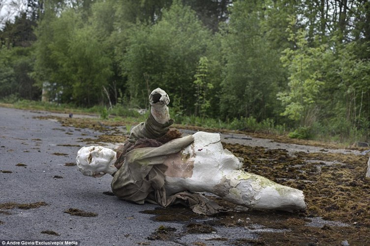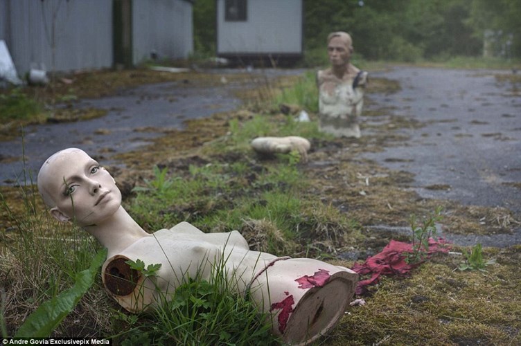 Mannequin nằm trơ trọi trên nền đất với cỏ dại mọc um tùm khắp nơi.