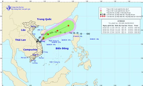 Cụ thể, hồi 07 giờ ngày 04/9, vị trí tâm áp thấp nhiệt đới ở khoảng 17,2 độ Vĩ Bắc; 109,7 độ Kinh Đông, cách đất liền các tỉnh Quảng Trị-Quảng Ngãi khoảng 200km về phía Đông Đông Bắc. Sức gió mạnh nhất vùng gần tâm áp thấp nhiệt đới mạnh cấp 6 (40-50km/giờ), giật cấp 8. Bán kính gió mạnh cấp 6, giật cấp 8 khoảng 60km tính từ tâm áp thấp nhiệt đới.