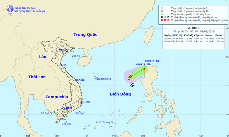 Theo Trung tâm Dự báo Khí tượng thủy văn Trung ương, hồi 01 giờ ngày 8/8, vị trí tâm áp thấp nhiệt đới ở vào khoảng 16,6 độ Vĩ Bắc; 117,8 độ Kinh Đông, cách quần đảo Hoàng Sa khoảng 570km về phía Đông. Sức gió mạnh nhất vùng gần tâm áp thấp nhiệt đới mạnh cấp 6 (40-50km/giờ), giật cấp 8. Bán kính gió mạnh từ cấp 6 trở lên khoảng 80km tính từ tâm áp thấp nhiệt đới.