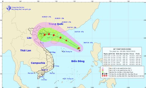 Theo Trung tâm Dự báo Khí tượng Thủy văn Quốc gia, sáng nay (30/7), vùng áp thấp trên Biển Đông đã mạnh lên thành áp thấp nhiệt đới.