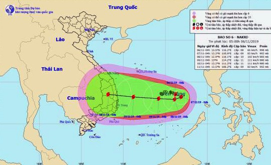 Theo Trung tâm Dự báo Khí tượng Thủy văn Quốc gia, tối 5/11, áp thấp nhiệt đới trên khu vực giữa Biển Đông đã mạnh lên thành bão, có tên quốc tế Nakri. Đây là cơn bão số 6 trên Biển Đông trong năm nay.